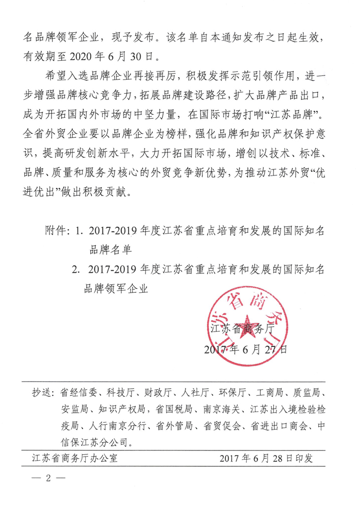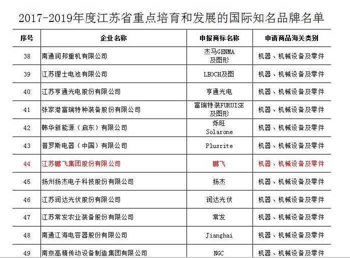 “鵬飛”入選江蘇省重點(diǎn)培育國(guó)際知名品牌名單