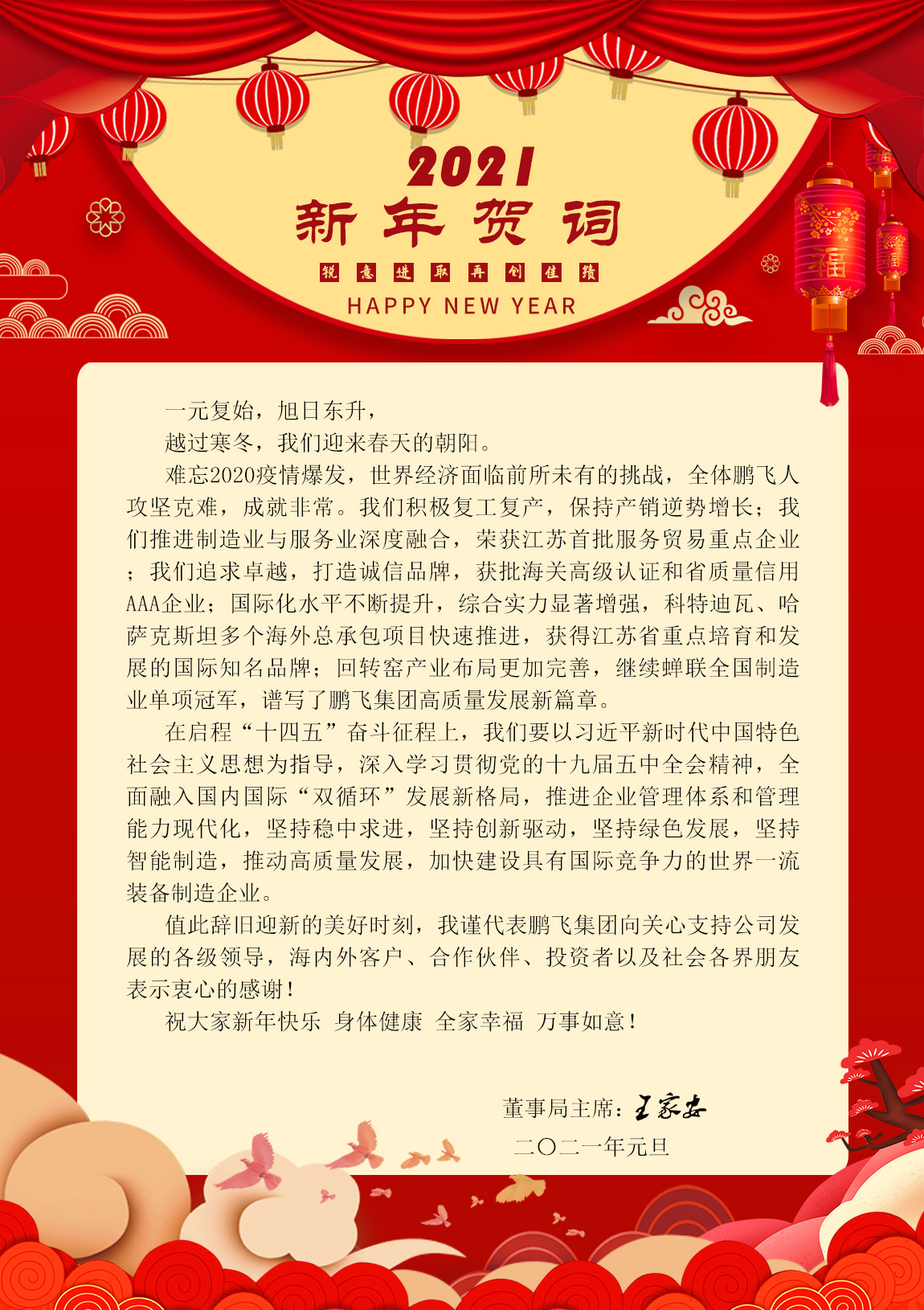 值此辭舊迎新的美好時(shí)刻,我謹(jǐn)代表鵬飛集團(tuán)向關(guān)心支持公司發(fā)展的各級(jí)領(lǐng)導(dǎo),海內(nèi)外客戶、合作伙伴、投資者以及社會(huì)各界朋友表示衷心的感謝!