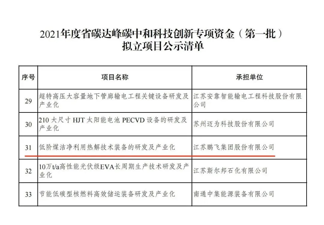 近日,江蘇省科技廳發布《2021年度省碳達峰碳中和科技創新專項資金(第一批)擬立項目公示》。座落于江蘇海安的鵬飛集團股份有限公司的“低階煤潔凈利用熱解技術裝備的研發及產業化”項目獲立項公示。利用回轉窯熱解技術進行低階煤提質清潔利用屬國內首創,項目已獲授權發明ZL10件、實用新型ZL9件。