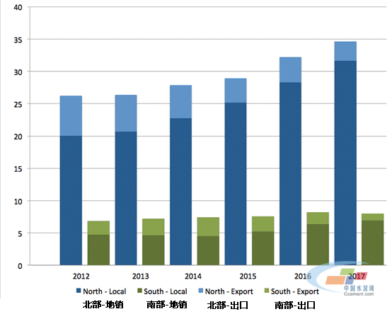 上圖展現了巴基斯坦國內水泥行業的現狀,巴基斯坦的年度水泥消費量從2012年的3310萬噸增長到了2017年的4280萬噸,增長幅度在30%左右,其中五分之四的水泥消費集中在巴基斯坦的北部地區。與此同時,更重要的是,巴基斯坦的出口水泥從2013年的830萬噸降低到了2017年的420萬噸。造成這一現象的主要原因是阿富汗市場的下跌,以及水性熟料出口量的減少。考慮到南方市場的出口水泥比例較高,盡管水泥總消費量在增長,但是出口量的減少對南方可能會造成更大的打擊。2018年到目前為止,類似的趨勢依然存在,唯一有所改變的是南方熟料出口量的在今年有反彈的跡象。