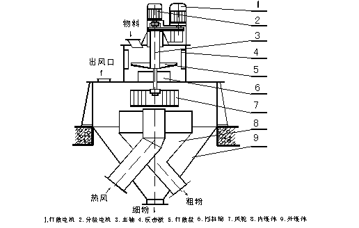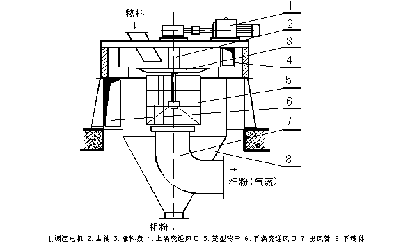 由傳動裝置、回轉部分(主軸、撒料盤、轉子等),機殼(內筒、導向葉片、內錐體、外筒、外錐體、進風口、加料口、兩個粗粉出口等),細粉收集裝置(四個旋風筒等)組成。