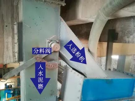 2 粉磨流程改進我們在出V型選粉機與入磨溜子之間安裝可調節翻板式分料閥(以下簡稱分料閥),該分料閥可將物料分為兩路,一路入磨機,另一路經空氣輸送斜槽入高效選粉機,同時,該分料閥還可進行10格調節(0%~100%)。試驗前后工藝流程簡圖及照片分別見圖1~圖3。
