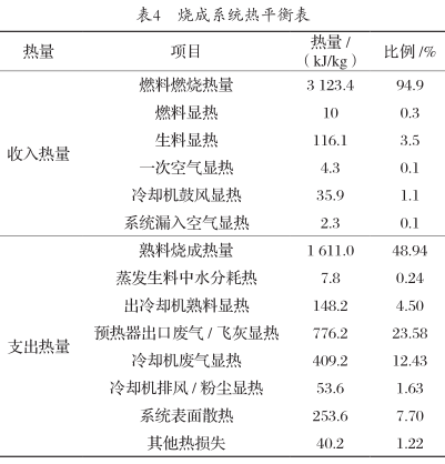 水泥窯系統(tǒng)熱平衡范圍主要包括燒成和冷卻機系統(tǒng),對該企業(yè)水泥窯系統(tǒng)的熱平衡進行測試,系統(tǒng)熱量收支平衡如表4所示。